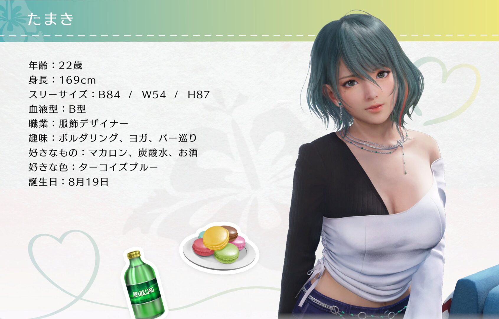 とある目的で島を訪れたセクシー美女。元モデルのデザイナー。美しいものが大好きで、美のためならば自分にも相手にも全力を尽くす。セクシーな雰囲気のなかで上品も兼ね合わせた大人の女性。